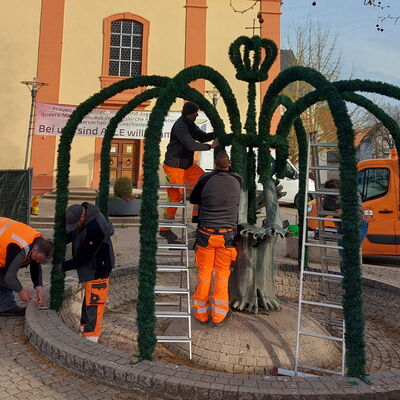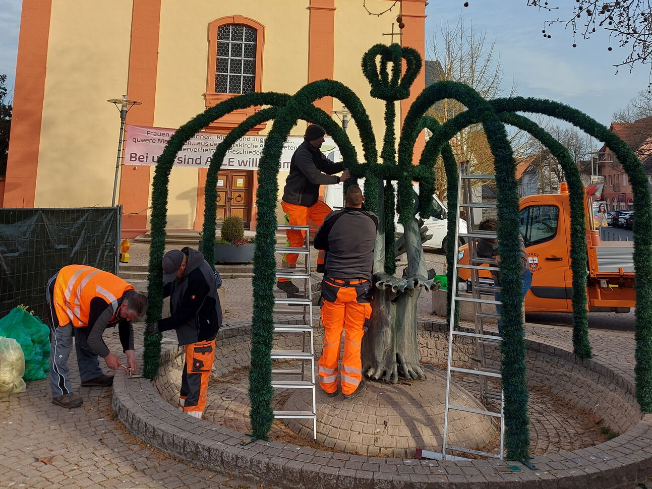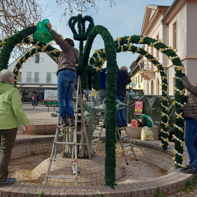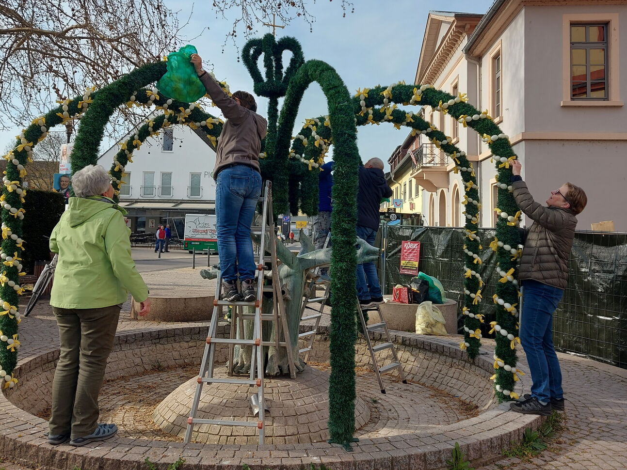 Das "Kernteam" Heike Geisinger, Ursula Jodl, Erika Müller-Walther und Christina Bauer übernahm das Umwickeln des vorbereiteten Gestänges mit den Eiergirlanden.